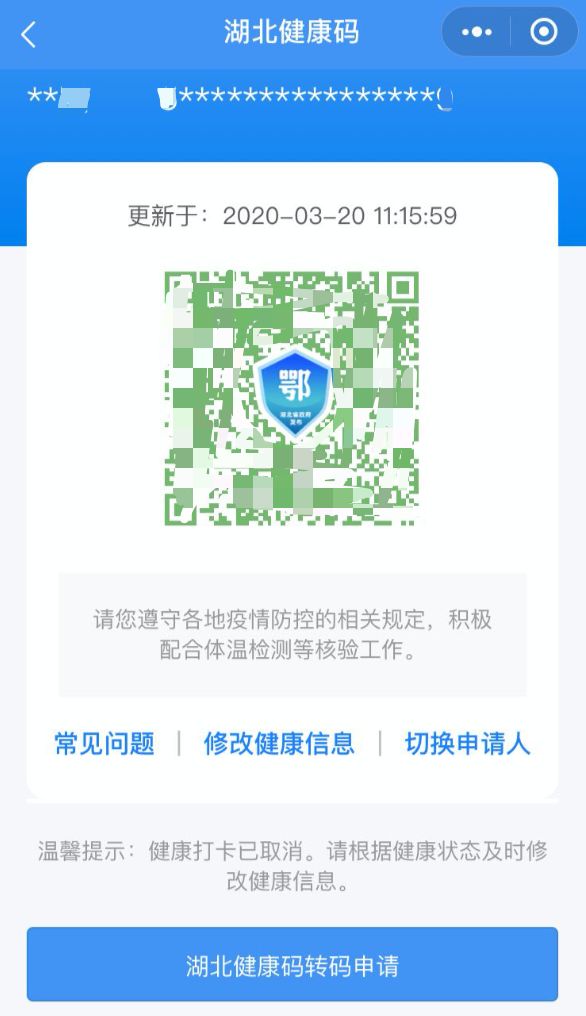 今天获悉,湖北健康码的健康打卡功能已取消。原有的健康打卡的按钮,变成了转码申请,用户可以根据健康状态及时修改健康信息。