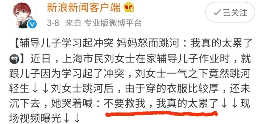 3月6日,上海妈妈刘女士,在家辅导孩子写作业,被孩子“逼疯”,跳河轻生。